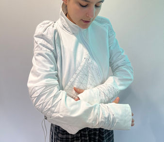 Inspired by origami, this jacket features concertina joints, enhancing range of motion for the wearer. Starting as a simple rhombus, topstitched before being pressed into a crescent moon and inserted into point of motion. The inserts allow greater extension at these points and move with the wearer for a visually interesting design.